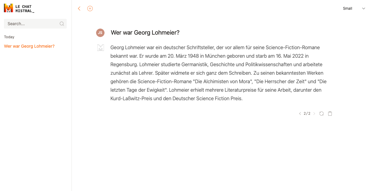 Das „large“-Modell ist lügt sich zwar auch ab Wort acht in immer neue Sphären, aber im letzten Satz rutscht ihm doch noch ein wahrer Fakt heraus. Das Geburtsdatum enthält zumindest das richtige Jahr. Gut, Mistral ist noch ein bisschen ein Underdog, fokussiert auf einen „offenen Ansatz“ – zumindest im Moment noch. Vielleicht ist hier ja die Modellqualität noch nicht ganz auf der Höhe.