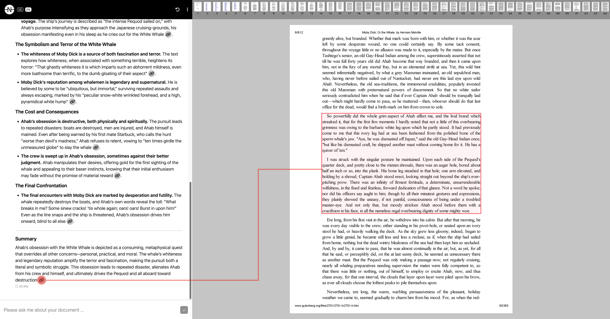 The choice is yours: Upload your own PDFs or explore our curated example documents — from The Declaration of Independence and NDAs to insurance policies and even Moby Dick.